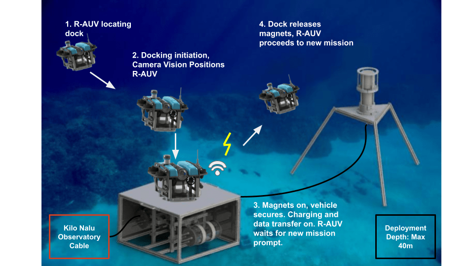 Another project I have led in this effort is the development of a docking station to be installed at a near shore observatory off the south shore of Honolulu, Hawaii. The objective of this project is to develop a shared, open-access AUV testbed, for collaborative marine robots at the Kilo Nalu Observatory (KNO). The long-term vision is to make KNO the first open-water test site for resident autonomous underwater vehicles (RAUVs) to accelerate research and education of related disciplines including oceanography, marine biology, and ocean and coastal engineering at the University of Hawaii. Myself along with colleagues have been developing an intelligent RAUV (an underwater robot that lives in the ocean) and a first-of-its-kind underwater docking station to be deployed at KNO by November 2021 through a research grant from the Department of Energy.