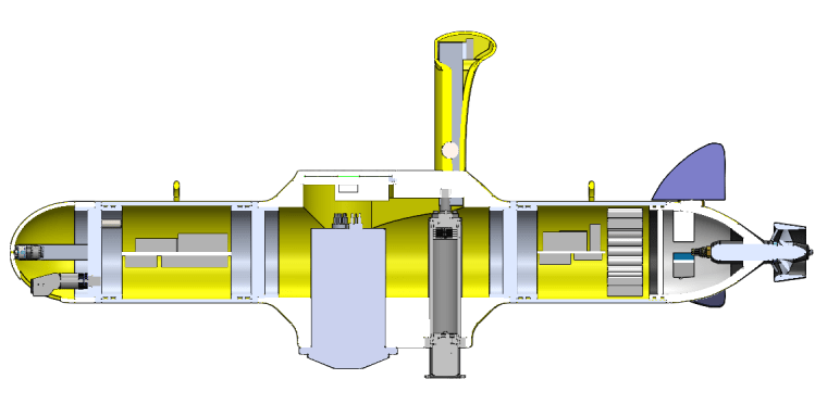 The docking operations begin with the SADL station receiving an underwater vehicle into a funnel-shaped guidance system shown in the images below. The vehicle then enters and ascends the vertical shaft where it is secured into a locked position. As shown in Figure 2, the example vehicle is seen in its docked position. The vehicle then descends the shaft and exits the aft of the station after charging and data transmission.