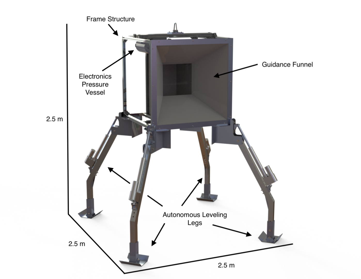 One of my primary research projects while a graduate student at the University of Hawaii has been autonomous underwater vehicle (AUV) docking. A docking station can enable a in situ charging and data transfer for an AUV. The first main effort that led the effort on was the Subsea autonomous docking lander (SADL) which was developed by a group of mechanical engineering students in affiliation with the Robot Autonomy and Navigation Lab at the University of Hawai‘i at Manoa. The design consists of three primary subsystems: a frame built from modifiable t-slot rails, a guidance and securance system, and an autonomous leveling system composed of 4 independent, actuator operated outrigger style legs.