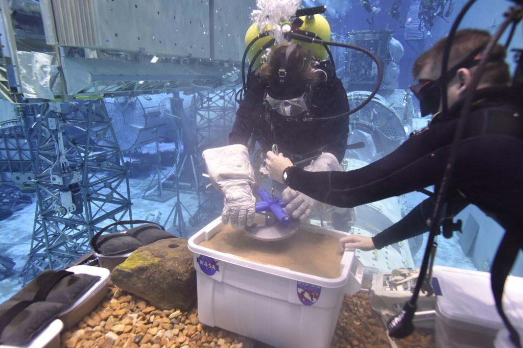 In the spring of 2017 myself along with my team from Kapiolani Community College travelled to Johnson space center in Galveston Texas to test a tool that we designed for use in a micro gravity environment. Our team designed a screw type anchor intended to anchor in the regolith of an asteroid. This design was selected for testing from a large pool of submissions. The tool was tested in the Neutral Buoyancy Laboratory (NBL), a facility where astronaut training is conducted underwater to mimic a zero gravity environment seen in the images. This opportunity was made possible by NASA’s Micro-g NExt program.