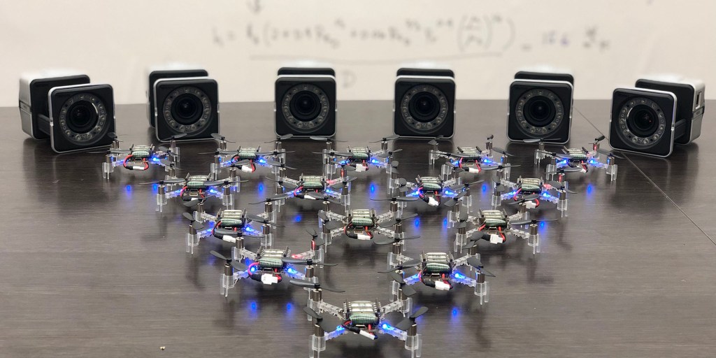 This testbed is in use for research being conducted with Crazyflie drones and Turtlebots as seen in the images. These platforms are being used to test and validate novel robot autonomy algorithms using the motion capture data as validation baseline.