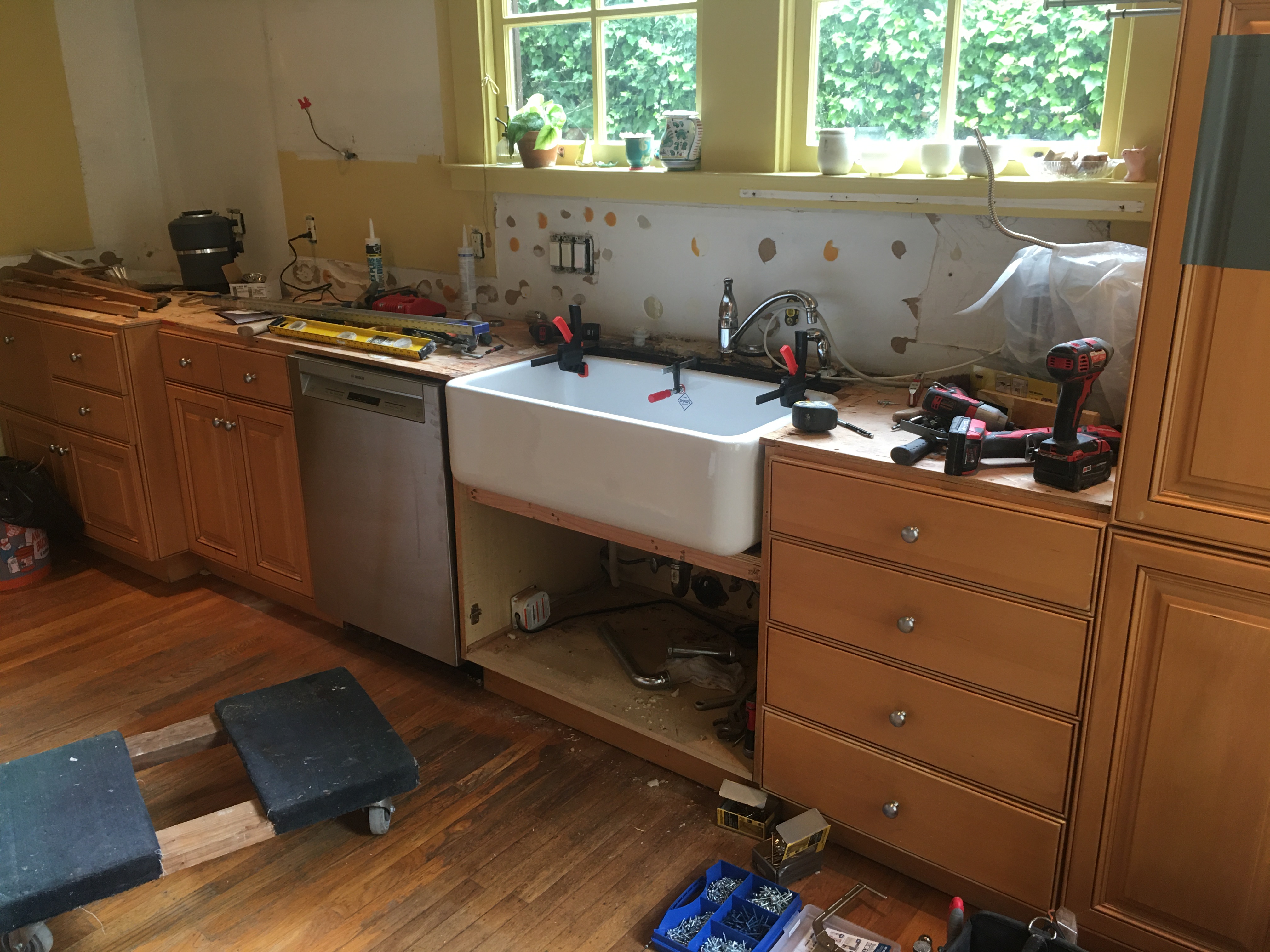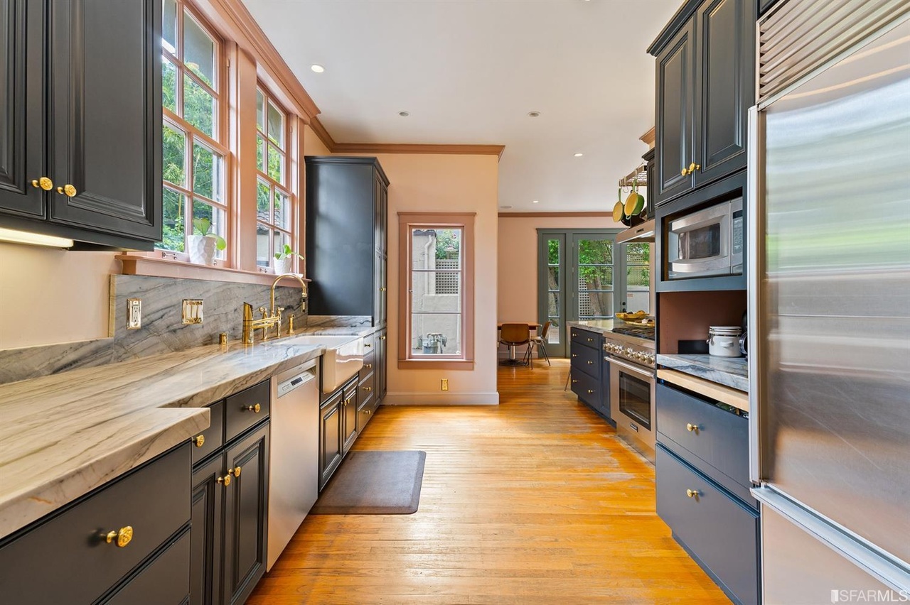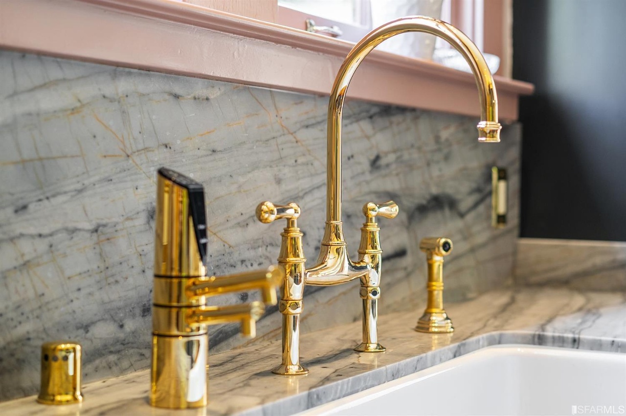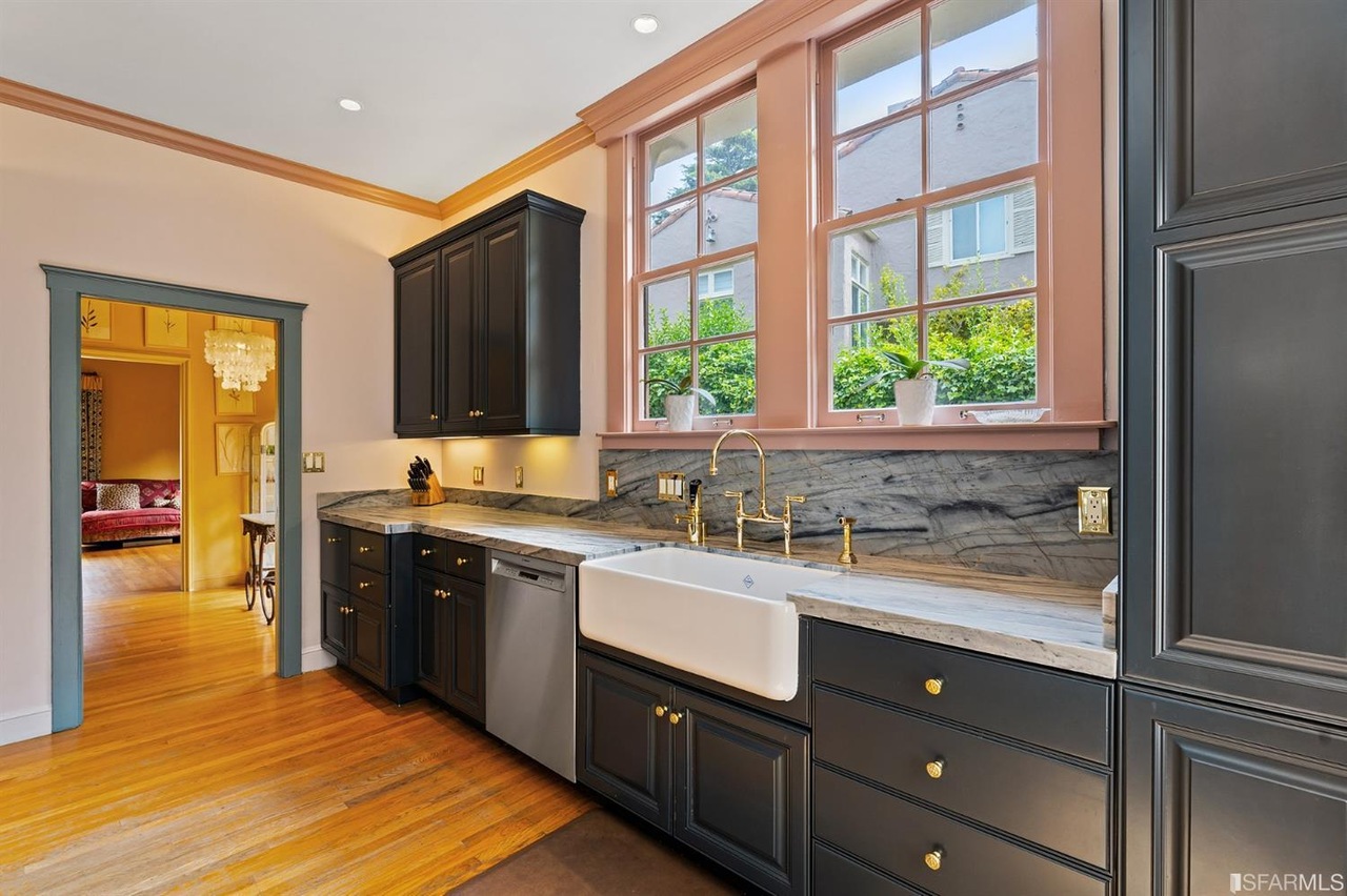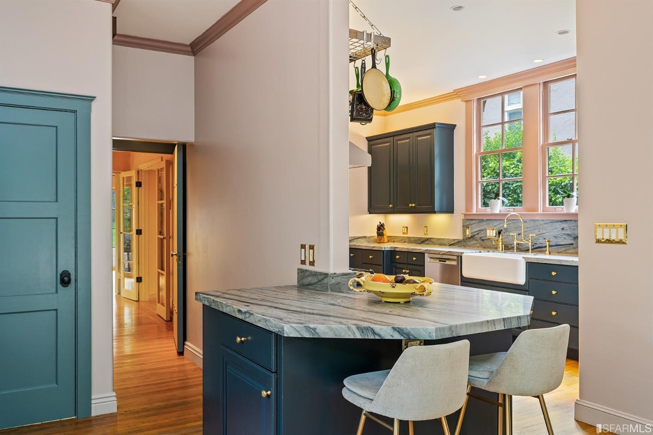 This kitchen in San Francisco was in need of face lift and splash of color. I worked hard with the home owner to nail the important items and while keeping the price point down. I put in a new farm sink and quartz countertop. Those features along with the gold hardware all around added the glam that the owner wanted. To minimize cost we left the cabinet boxes and doors and refinished then in a very dark blue. some light pink walls, dark pink trim and teal doors gave the whole space a new clean feel.